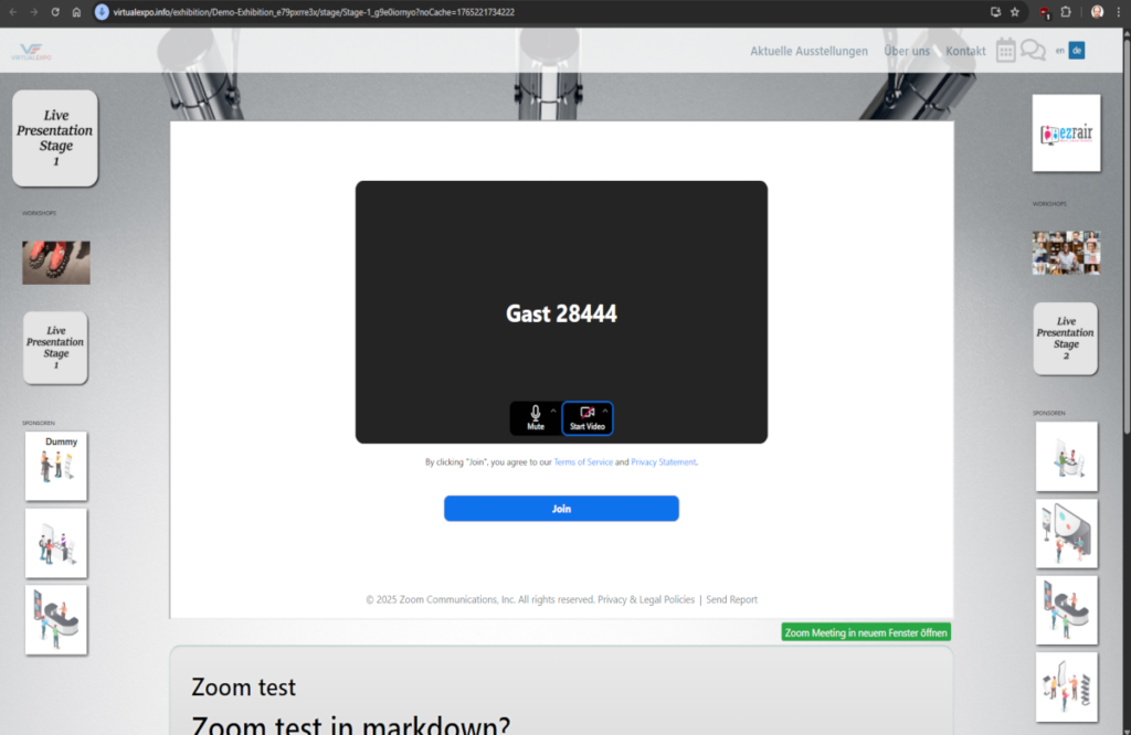Jede Expo bei VirtualExpo hat die Möglichkeit mit Zoom-Meetings Besucher in Live-Konferenzen einzubinden.